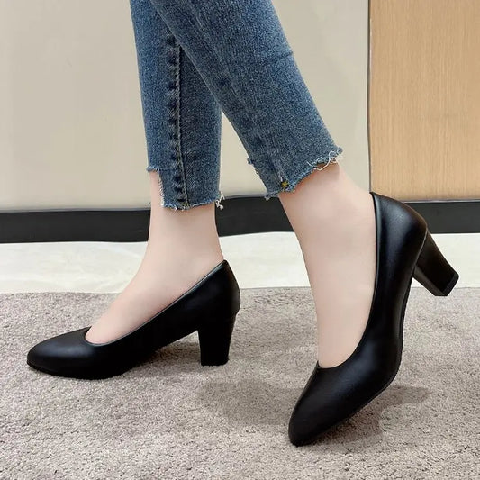 Women Leather Mid Heel Pumps 2023 New High Quality Shoes Classic Black High Heels Shoes for Office Ladies Shoes Womens Shoes