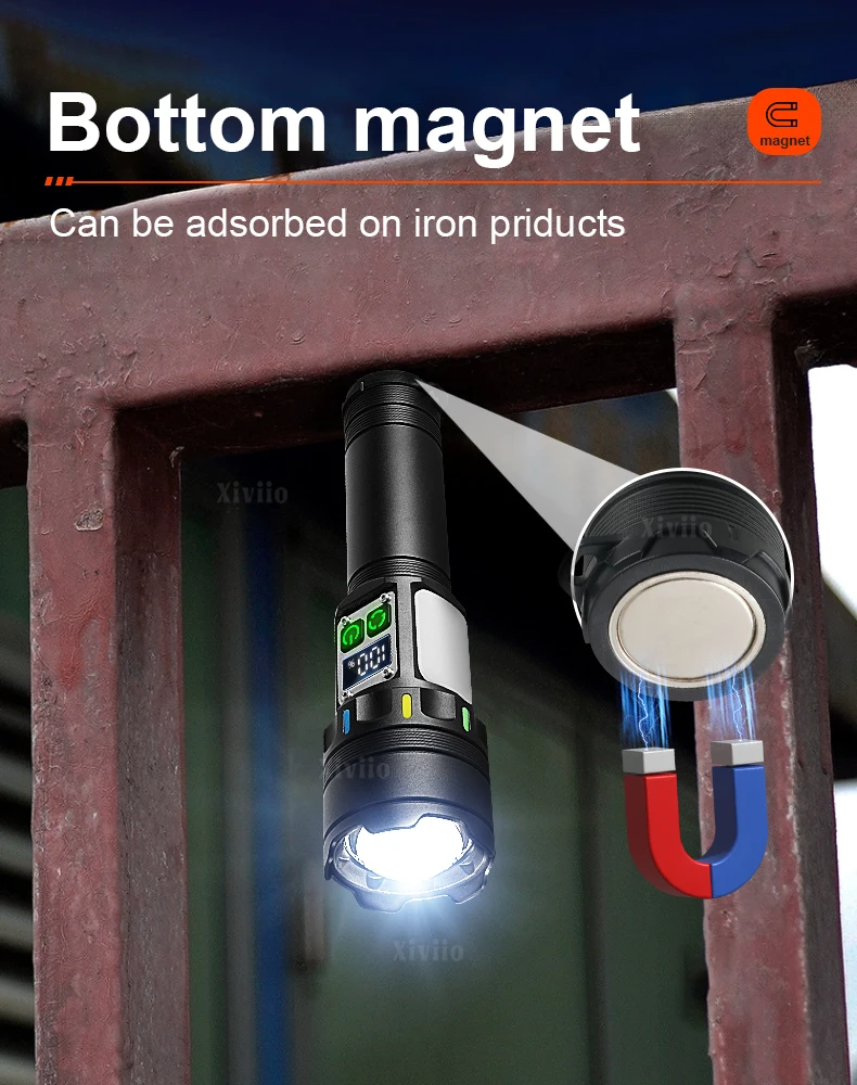Forte magnétisme : la forte fonction de magnétisme est ajoutée à la queue, qui peut adsorber la lampe de poche sur la surface de toute substance en fer, libérant ainsi les mains pour travailler.Utilisé pour l'entretien automobile et l'éclairage en cas de panne de courant.