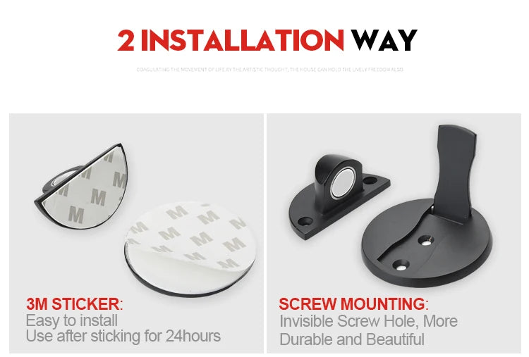 There are 2 ways to install the doorstop, install by screws or by nail-free sticker.