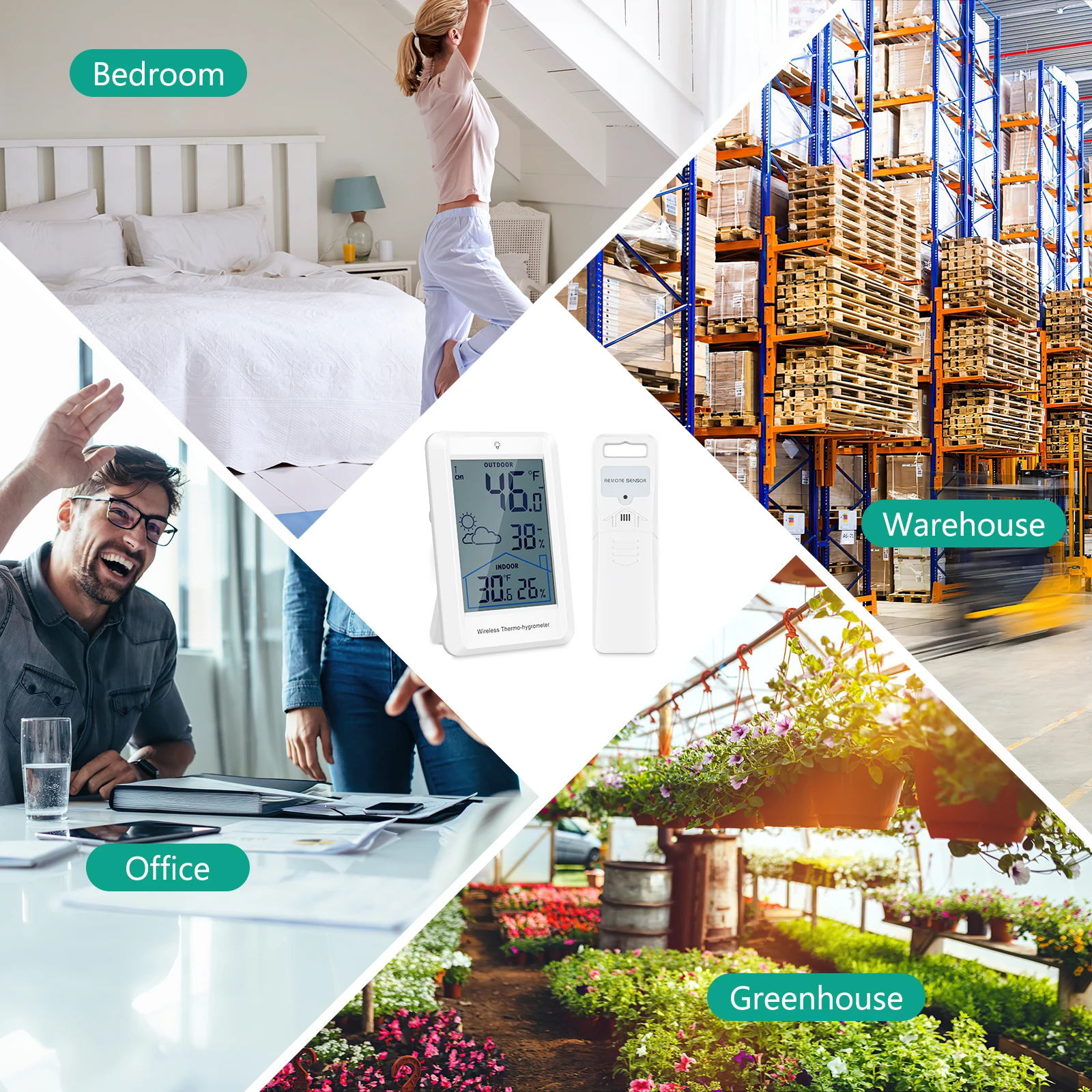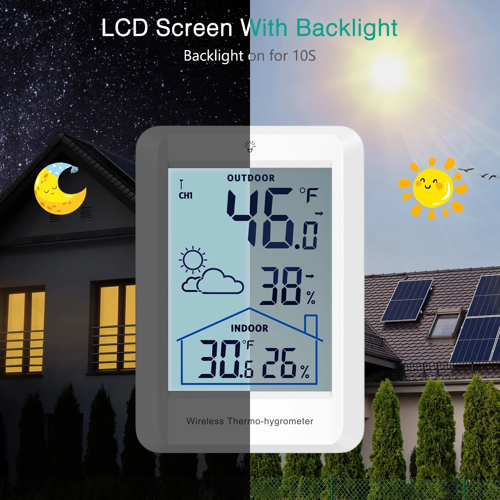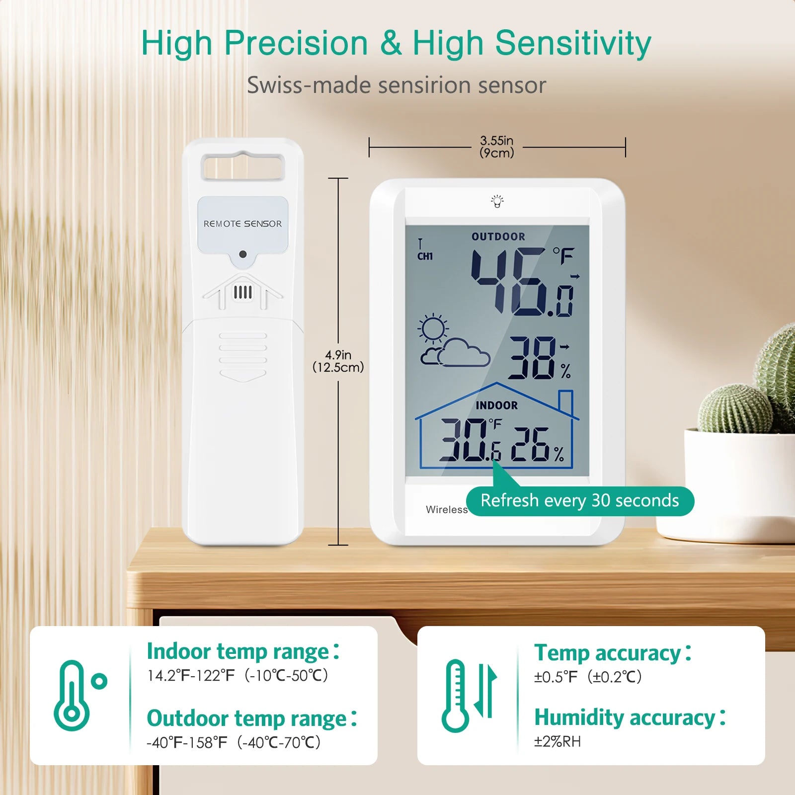 【Wireless Transmission Technology】The Wireless temperature and humidity monitor updates every 30 seconds and transmits temperature and humidity data up to a radius of 330 feet, which will help you monitor all the locations you care about most.