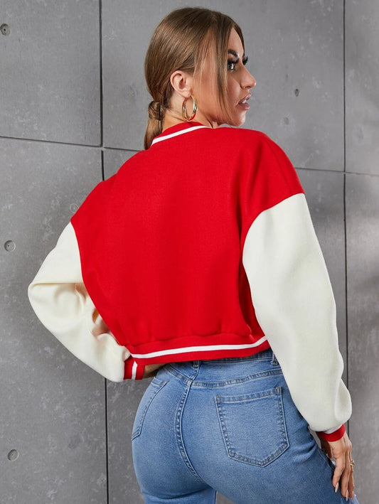 Flirla Letter Patched Striped Trim Drop Shoulder Varsity Jacket