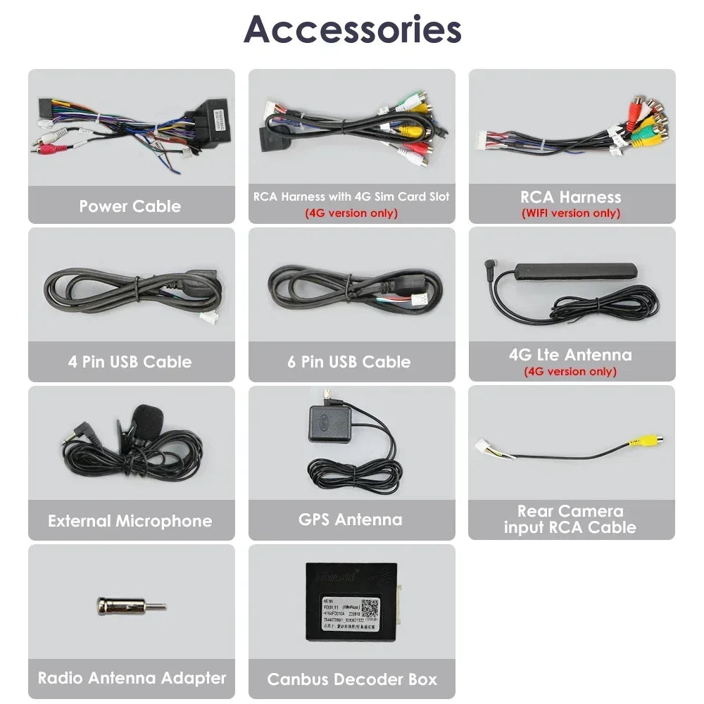 2) ADAS DVR Camera, Tire Pressure Monitoring, OBD2, External Microphone, RCA cable; 3) If the Car Original Wire connectors is special(not the same as our accessories Pin) which needs to order separately adapter for install.