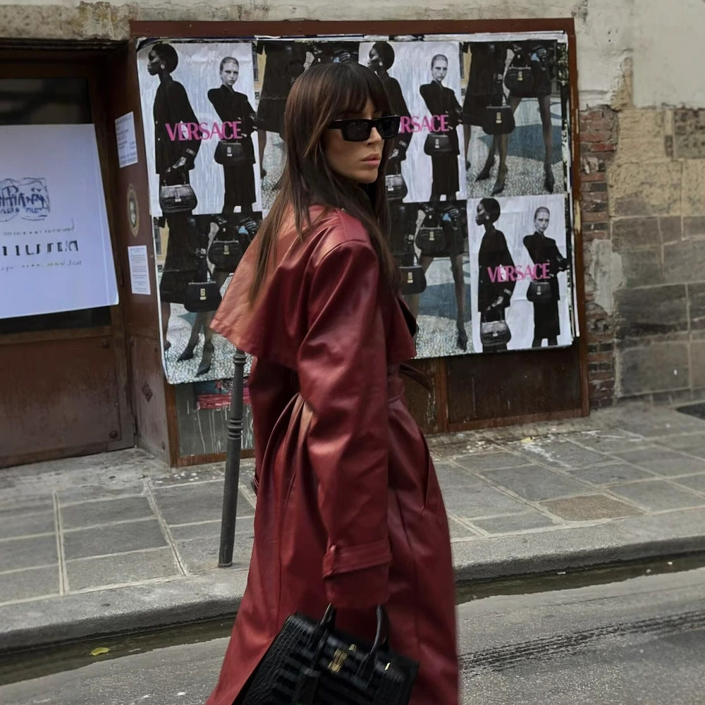 Medium length leather jacket with loose fit for women